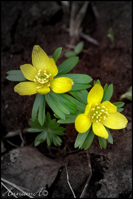 Och jag har två sorter - denna med gröna blad - 'Eranthis hyemalis', och en med brunaktiga blad, som blommar lite senare.